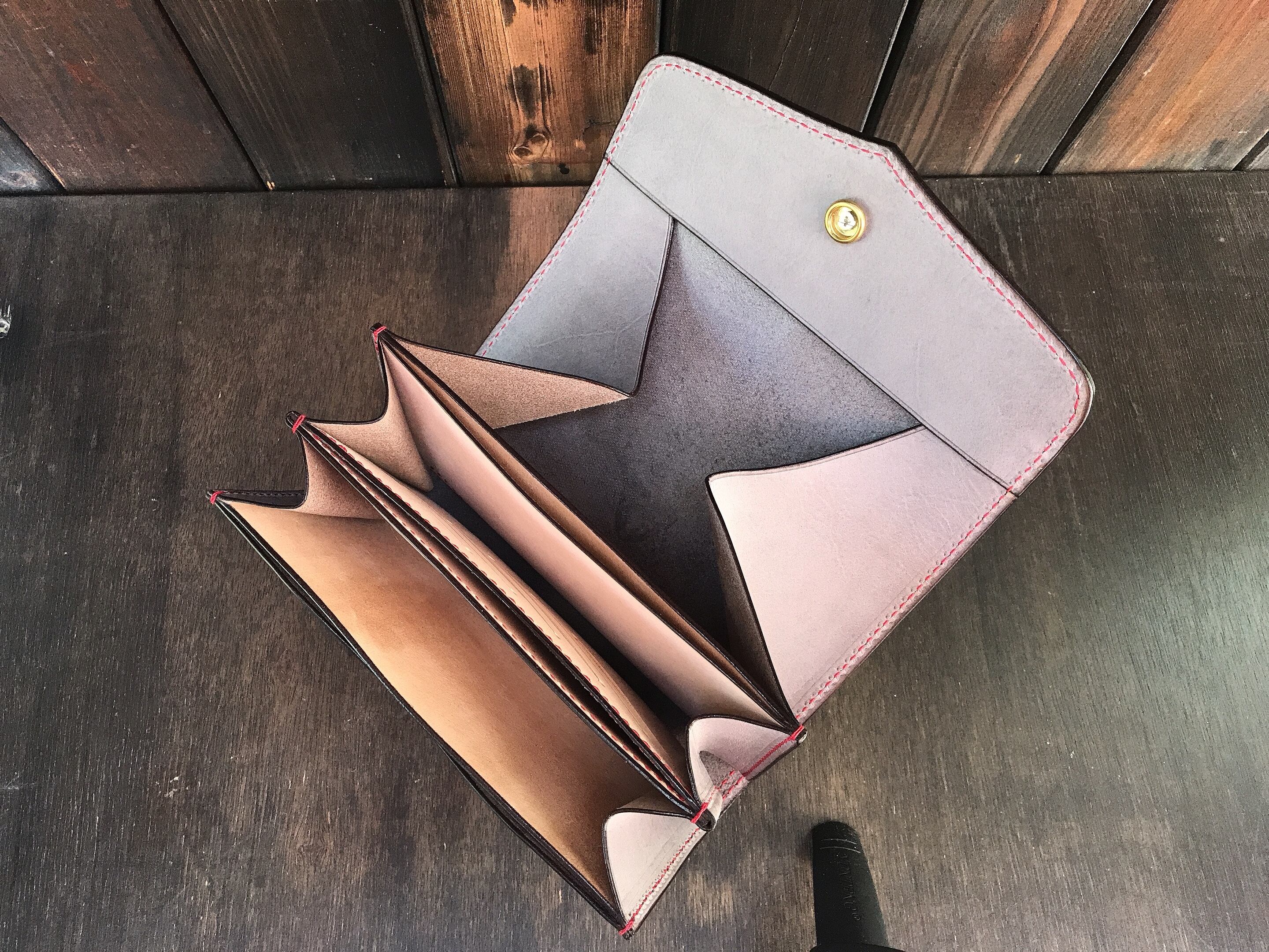 外装はオイルレザー銀擦り(表面を軽くサンディング)し、オイルで仕上げた植物タンニン鞣し素材