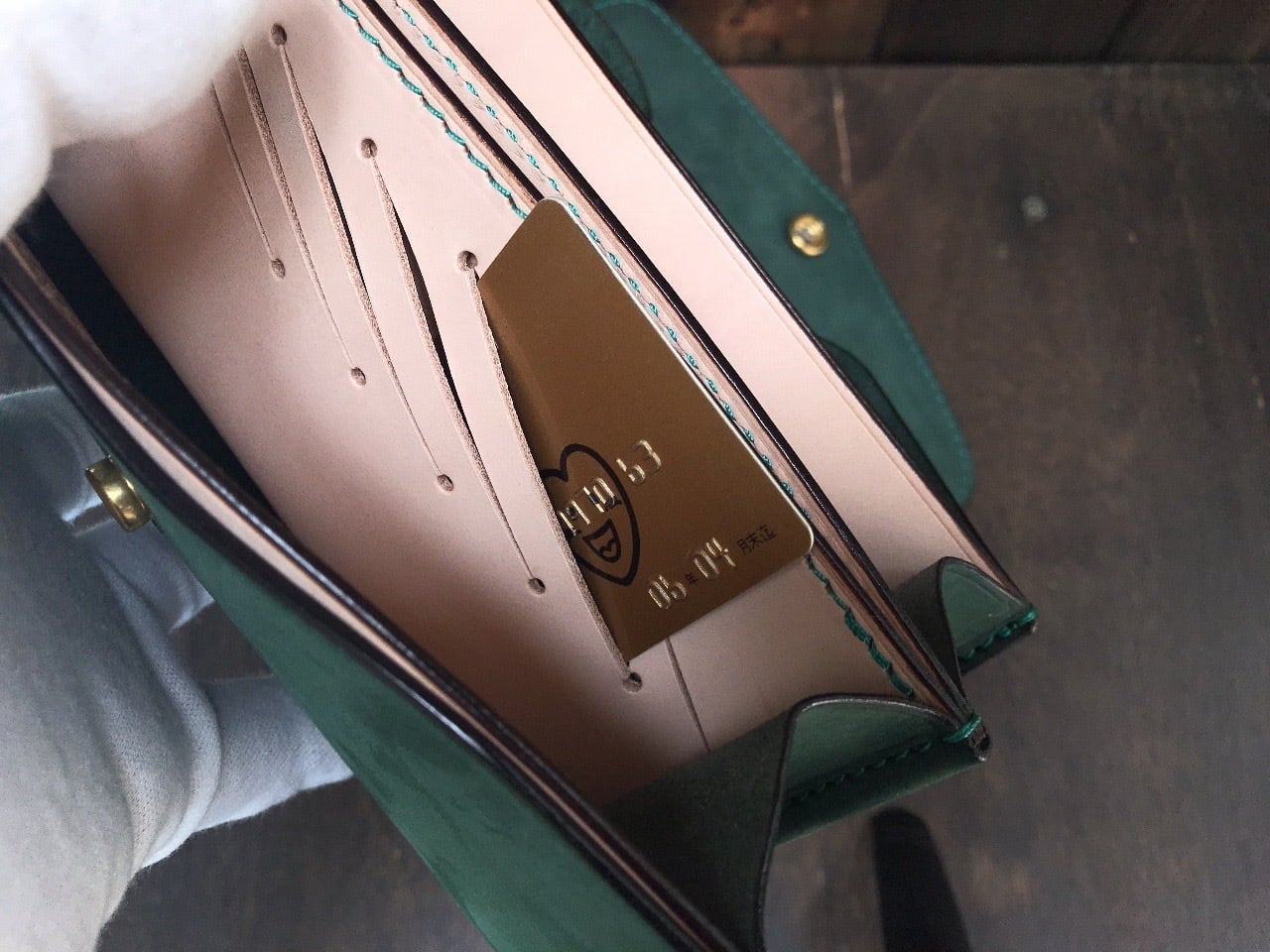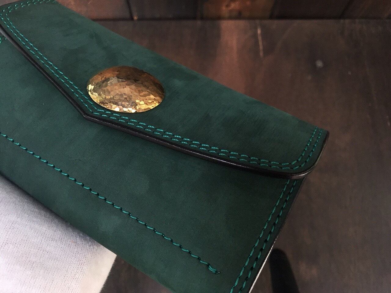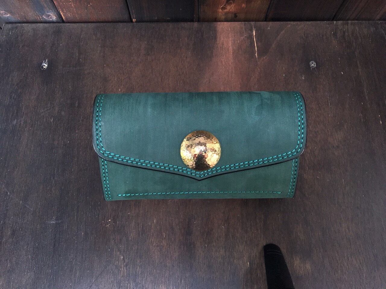 私のイメージに合うダークグリーンの素材と巡り逢う機会があり、お財布を製作しました。